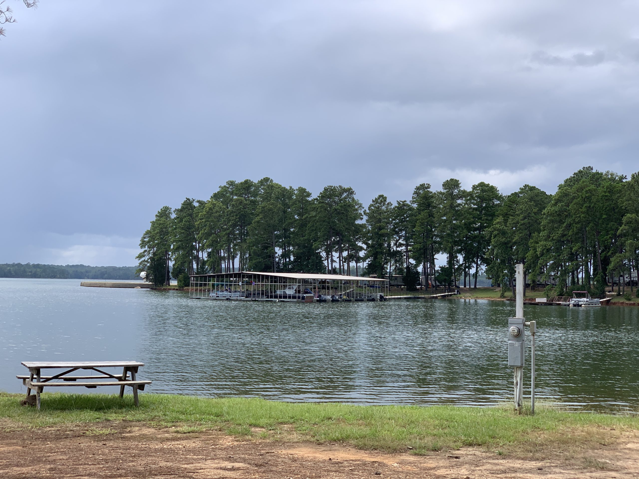 Campsites are available for days, weeks, and months at a time. Please call for availability and pricing information. There is no limit to RV sizes. We have electrical service (30 &/or 50 AMP) and water on the grounds. Some sites have septic hookups. We also have RV storage. Primitive tent options are available with no water or electricity. We have a bathhouse on-site, a Ship’s Store on-site for beverages, snacks, ice, and other basic items such as water, soft drinks, beer, snacks, tackle, lake maps, charcoal, and ice cream!